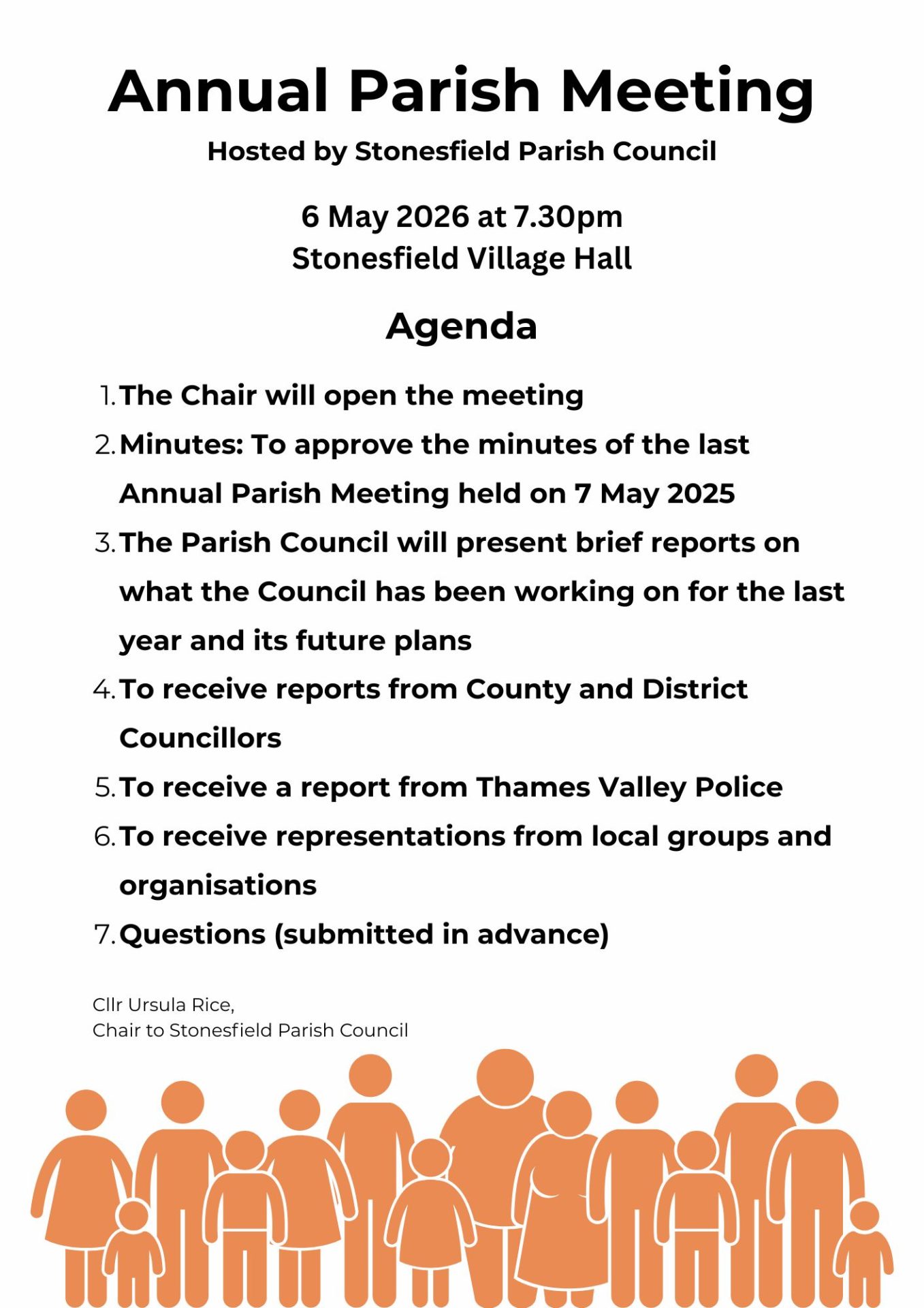 Residents are invited to the Village Community Meeting, facilitated by the Parish Council. Local groups and the Council will give updates on the past year and future plans. Residents can raise issues, ask questions and share views. Questions can be submitted in advance to the Parish Clerk.